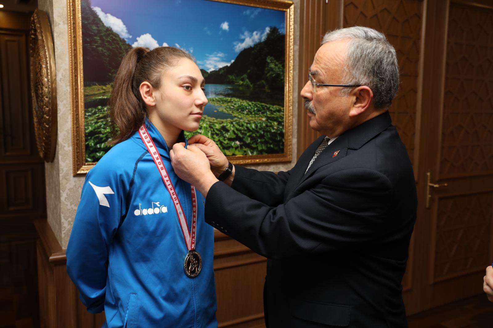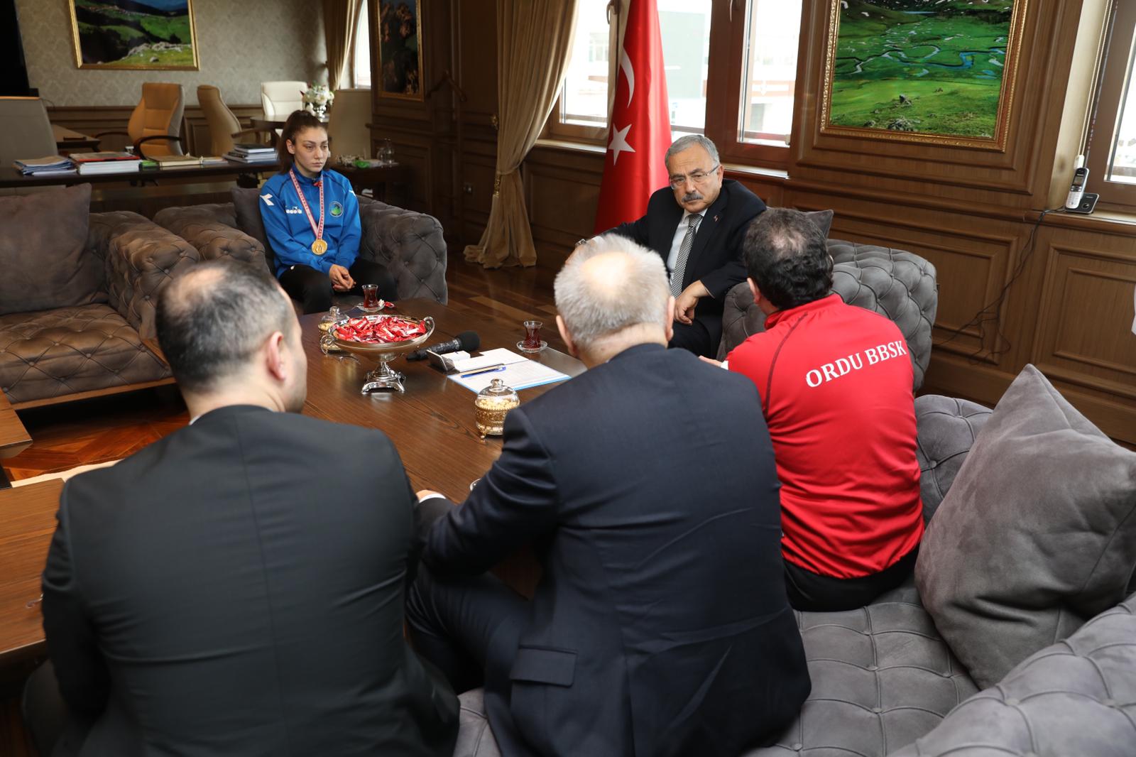 Ordu Büyükşehir Belediye Başkanı Dr. Mehmet Hilmi Güler; Üst Minik, Yıldız ve Genç Kadınlar Türkiye Ferdi Boks Şampiyonası’nda Türkiye şampiyonu olan Ordu Büyükşehir Belediyespor Kulübü sporcusu Gamze Soğuksu’yu ağırladı.