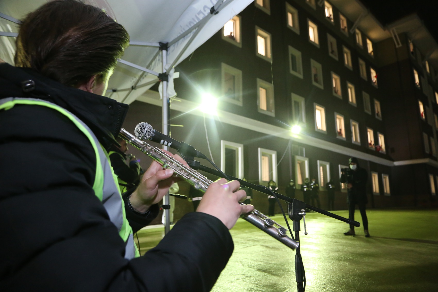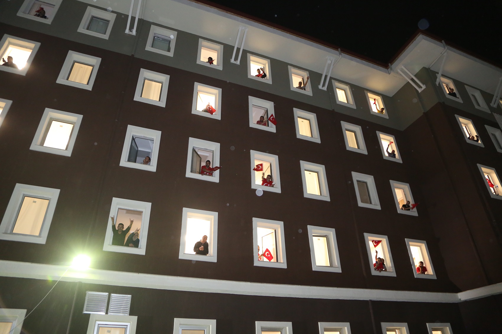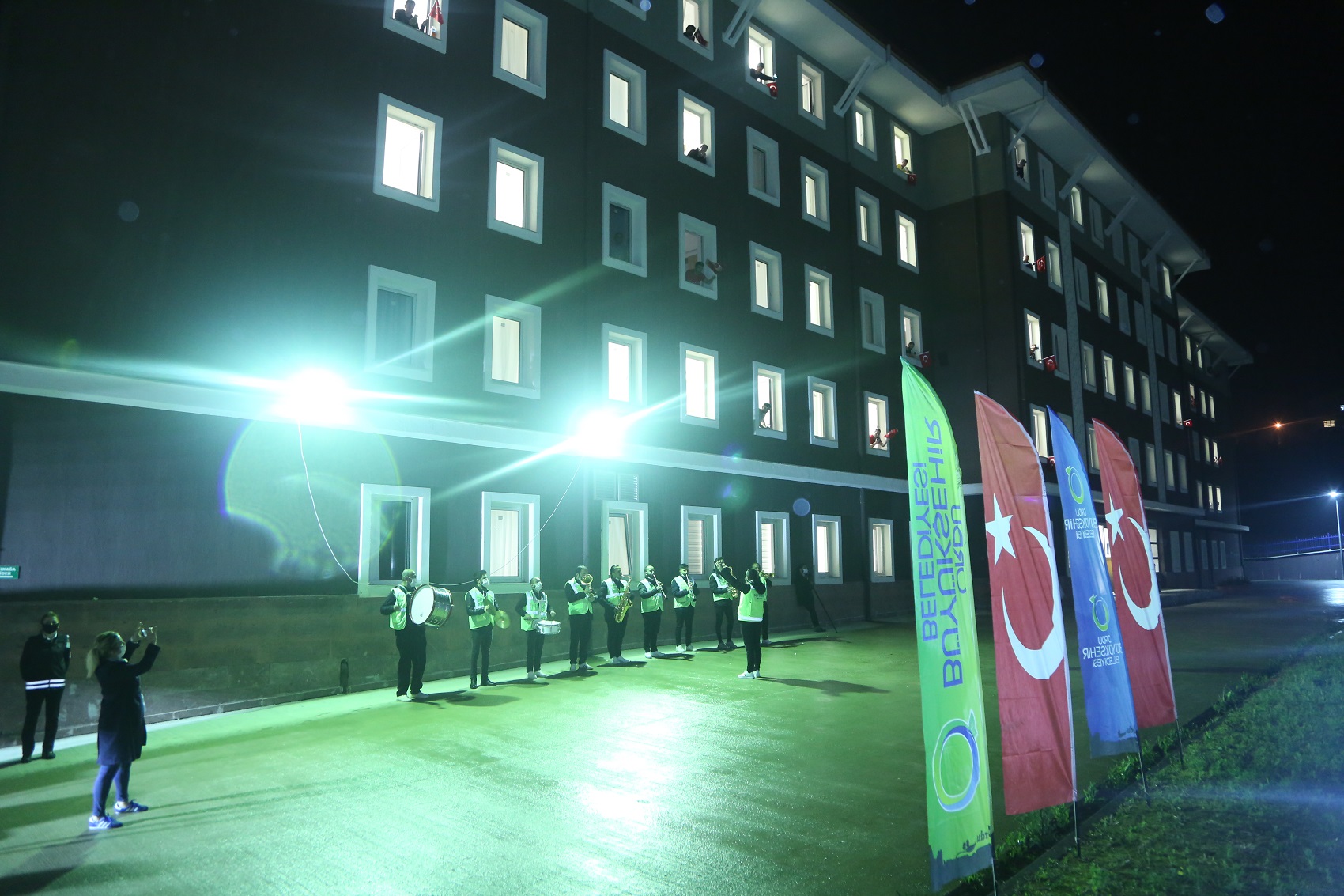 Sosyal mesafe kurallarına uyularak gerçekleştirilen konser öncesi, yurtta karantina altında olan vatandaşlara görevliler tarafından Türk bayrağı dağıtıldı.