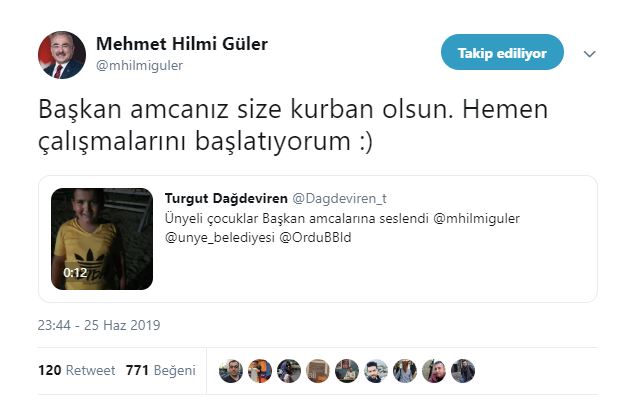 Videoda “Başkan amca su parkurundan ve oyun parkurundan Ünye’ye de yaptır ne olur ne olur” diyen çocuklar Başkan Güler’i de etiketleyerek Twitter hesabından paylaşım yaptılar. Çocukların isteğine anında yanıt veren Başkan Güler ise, “Başkan amcanız size kurban olsun. Hemen çalışmalarını başlatıyorum” diyerek müjdeyi verdi.