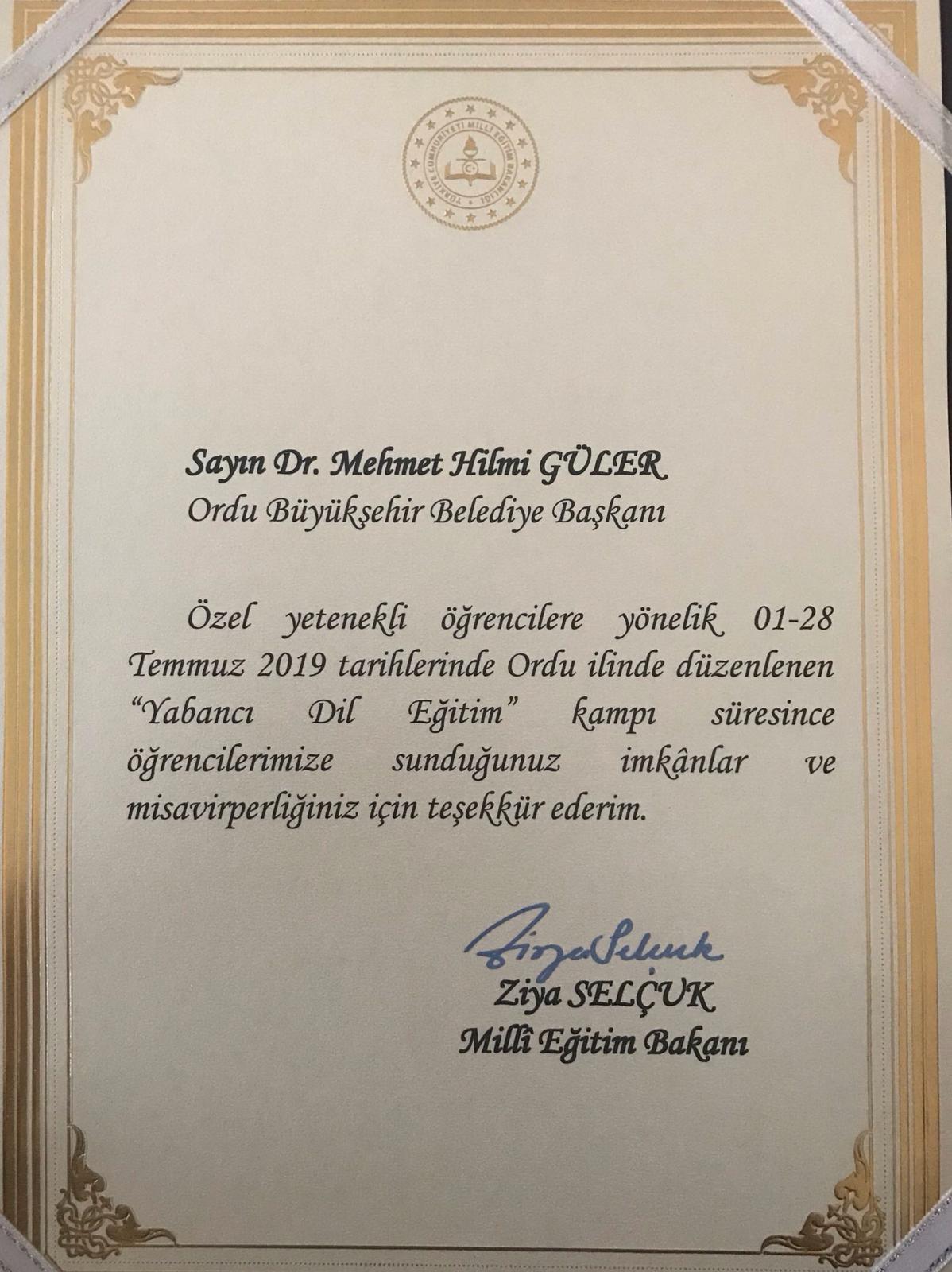 Özel yetenekli öğrencilere yönelik 1-28 Temmuz tarihlerinde Ordu’da düzenlenen “Yabancı Dil Eğitim Kampı” sona erdi. Kamp süresince öğrencilere sunduğu imkanlar ve misafirperverliğinden ötürü Ordu Büyükşehir Belediye Başkanı Dr. Mehmet Hilmi Güler’ ödülü takdim edildi.
