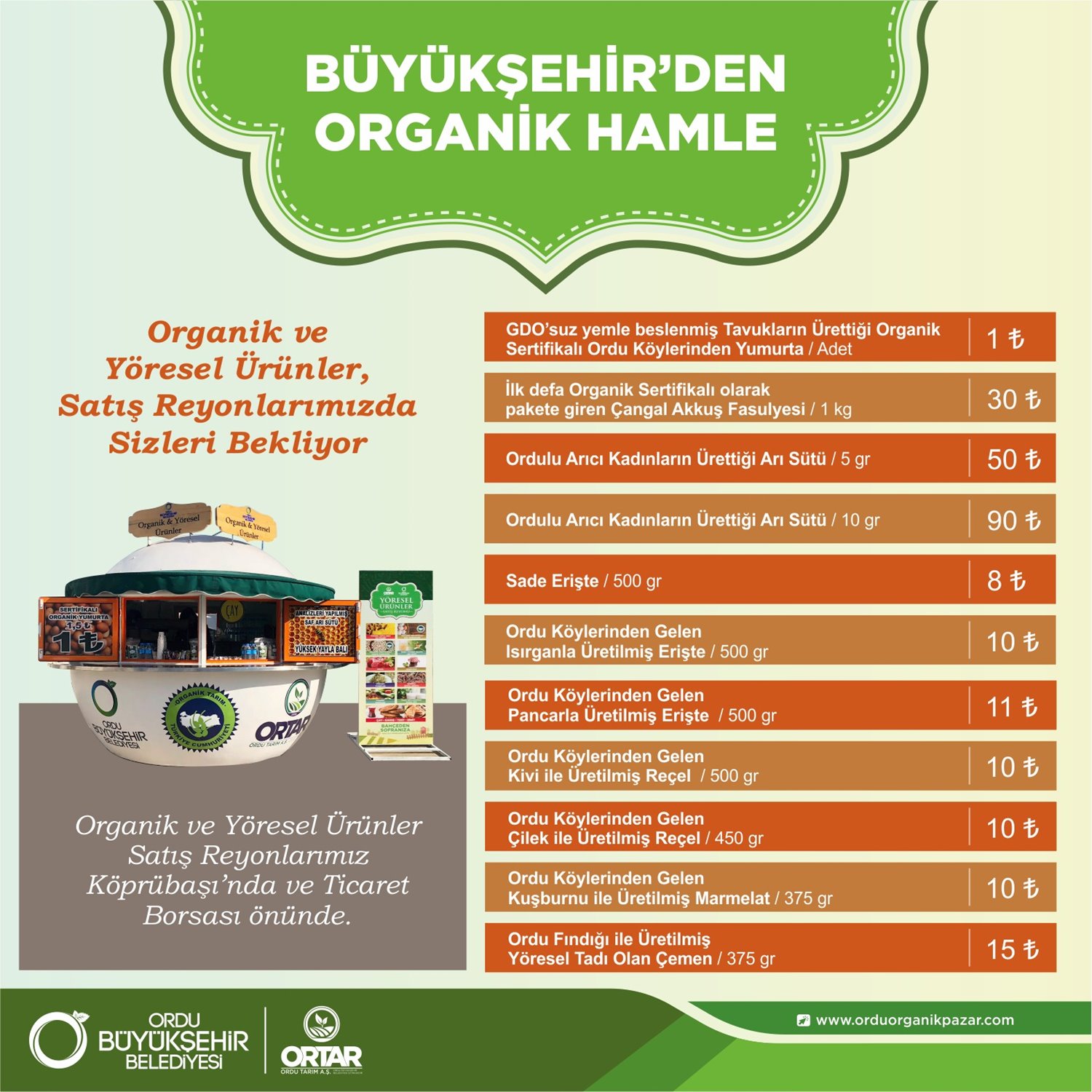 Ordu Büyükşehir Belediyesinin iştiraki olan ORTAR A.Ş. tarafından açılan büfelerde satışı gerçekleştirilen yöresel ürünler hem vatandaşların doğal ürünlerle beslenmesini sağlarken hem de üreticilerin kazanç elde etmesine katkı sağlıyor. Vatandaşların yoğun ilgi gösterdiği büfelerde; reçel çeşitleri, arı sütü, organik yumurta, erişte çeşitleri, Akkuş çangal fasulyesi ve çemen gibi ürünlerin satışı gerçekleştiriliyor.