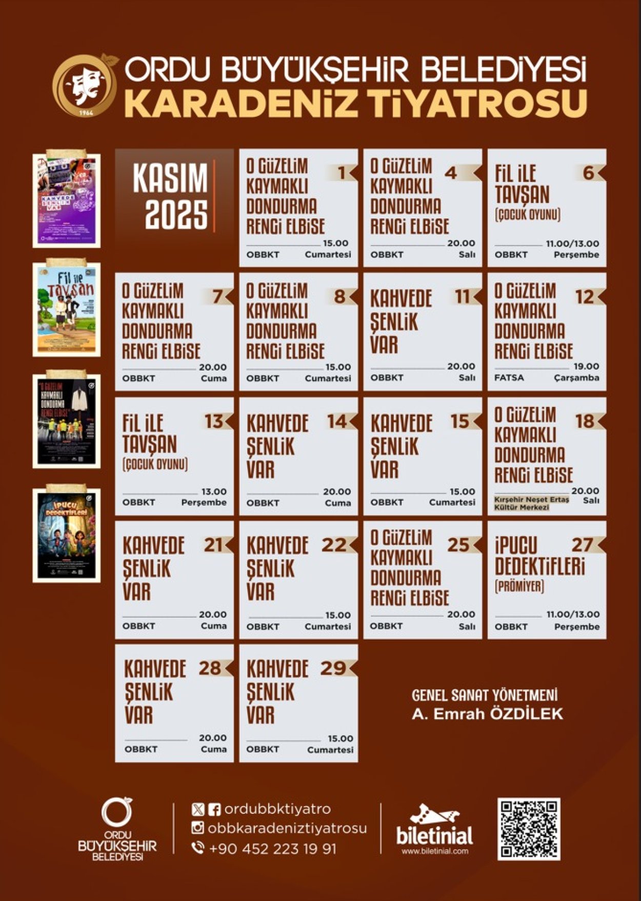 61 yıldır perdelerini hiç kapatmayan Ordu Büyükşehir Belediyesi Karadeniz Tiyatrosu (OBBKT) Ordu başta olmak üzere diğer il ve ilçelerde yapacağı tiyatro gösterileri ile Kasım ayında tiyatroseverlerle buluşacak. Büyükşehir Belediyesi Kültür Turizm ve Sanat Dairesi Başkanlığı tarafından hazırlanan Kültür Sanat Etkinlikleri Kasım Ayı Takvimi kapsamında OBBKT, hem güldürecek hem de düşündürecek.